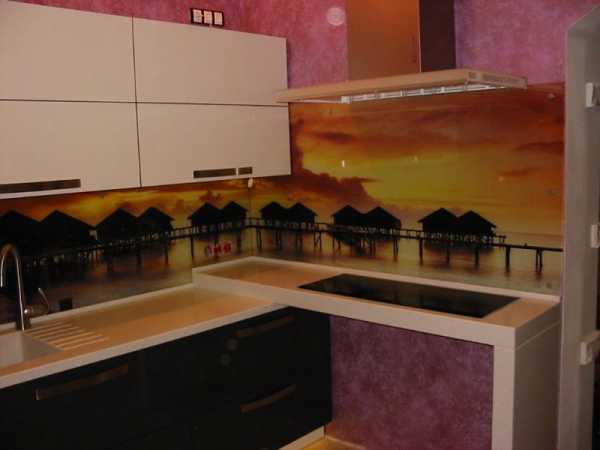 Для фартука стоит выбрать влагоустойчивое покрытие, например, стеклянную панель. Если разместить за ней узкие фотообои с городским пейзажем, можно разнообразить интерьер и придать ему дополнительную перспективу.