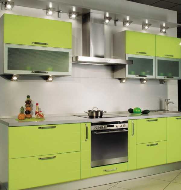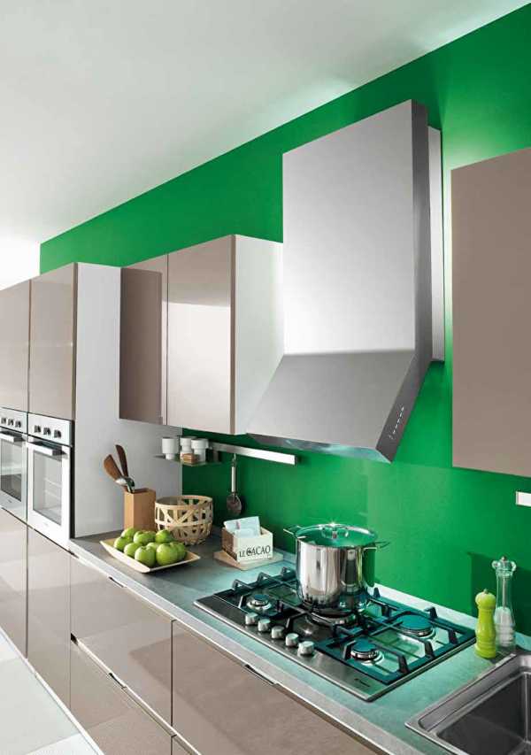 Цвет весенней листвы — лучший выбор, если хочется сделать кухню яркой и одновременно спокойной. Хорошим фоном для зеленого гарнитура будет бежевая стена, а серые и деревянные вставки еще больше подчеркнут его красоту.