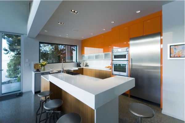 К категории угловой меблировки также относят кухни, имеющие П-образную форму. Одно крыло гарнитура можно использовать для перекусов, вместо барной стойки или для готовки. Не менее практично можно использовать и другие части мебели.