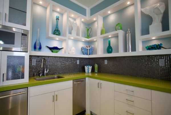 Если вам нравятся открытые полки и стеллажи, расположите на них маленькую бытовую технику или кухонные принадлежности, соответствующие оформлению помещения.
