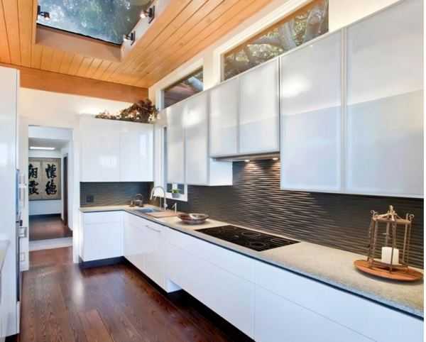 Все фото На фото: Светящийся фартук в дизайне кухни модернСветящийся фартук из шпона камня – одна из ультрамодных деталей в интерьере кухни модерн на фото. Он не только красив, но также практичен и функционален. Благодаря спрятанной за ним светодиодной ленте фартук прекрасно освещает рабочую столешницу, так что оборудовать ее дополнительными источниками света нет необходимости. Кроме того, светящееся панно отлично подчеркивает геометрию кухонного блока и может выступать в роли ночного светильника.