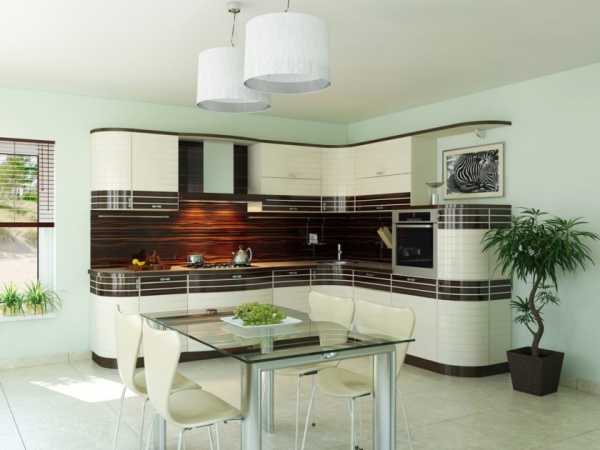 Учитывая, что в подобных кухнях допустимо наличие плавных линий, вы можете приобрести гарнитур со скругленными углами и фасадами с радиусными формами.