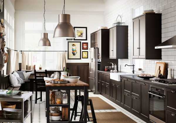 Подобные цвета в ассортименте ИКЕА представлены черными и коричневыми тонами. Такие гарнитуры хорошо вписываются в просторные помещения с высокими потолками. С помощью темной мебели можно создавать классические и современные комнаты для приготовления пищи. Подобный дизайн нуждается в обязательном разбавлении светлыми тонами. Темный гарнитур будет красиво смотреться в кухне с белыми стенами и потолком.