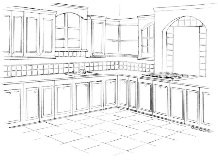 Красивый рисунок карандашом угловая кухня.