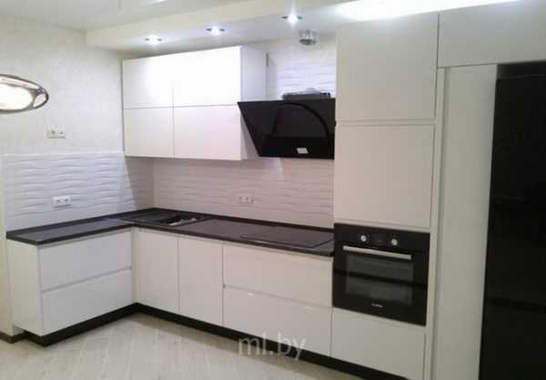 Черно-белая кухня с фасадами из МДФ с высокими верхними шкафчиками