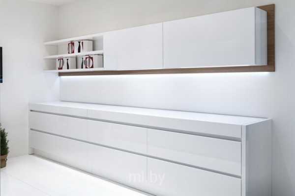 - Шкафы до потолка зрительно увеличивают высоту стен. Открытые полки как бы расширяют пространство. Оптимальными для этого будут светлые тона, еще лучше – шкафы, имеющие глянцевую поверхность. Но за ними нужен постоянный уход.