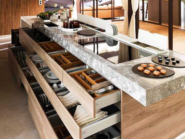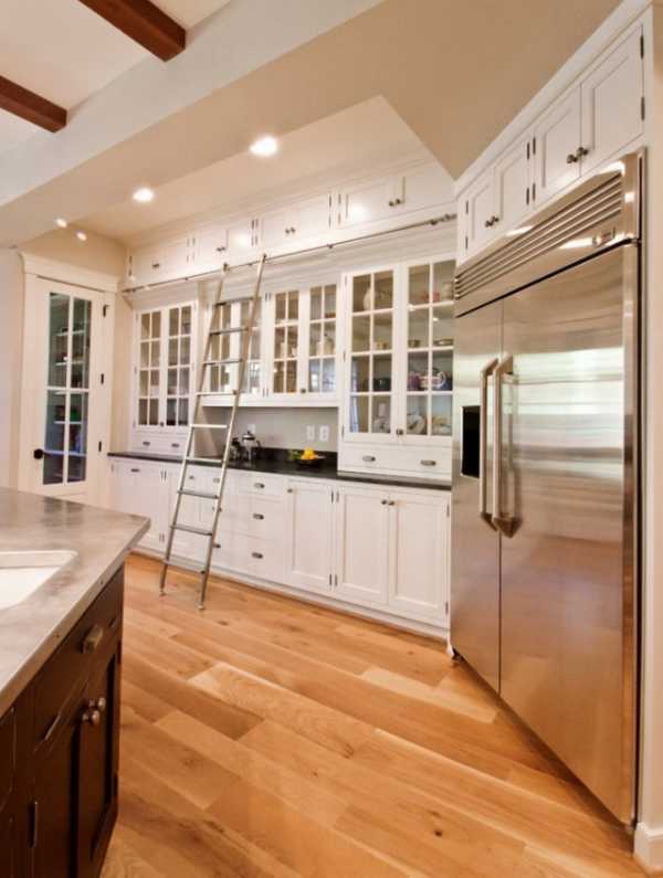 На практике у этого решения на кухне только один недостаток: к верхним полкам и ящикам нельзя дотянуться. Довольно часто такие гарнитуры оснащают специальной лестницей, использовать которую может не всякая хозяйка.