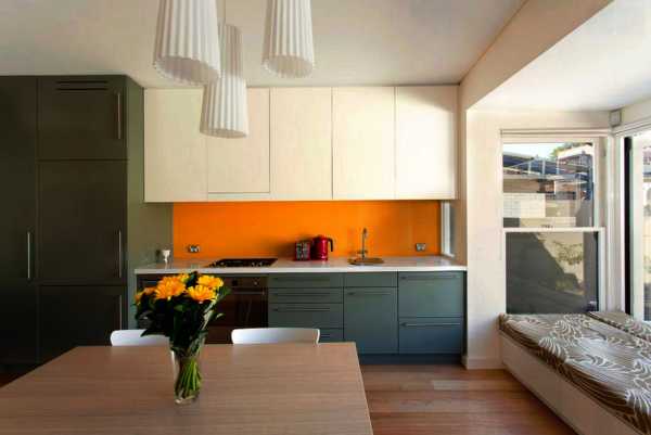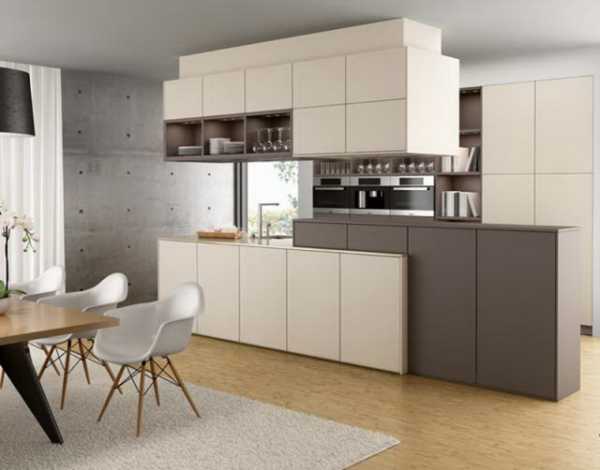 Проектирование нынешних кухонь дает возможность проводить эксперимент с месторасположением предметов мебели. Всем привычный нам классический вид, то есть размещение навесных шкафов над областью приготовления пищи, уже не пользуется популярностью. Ранее мебель обычно ставили у стенки, но сейчас чаще стали располагать в центре комнаты. Это дает возможность поделить кухню, если позволяет ее площадь, на две главные зоны – место приготовления пищи и обеденную зону. Когда шкафы доходят до потолка, формируется полное имитирование стены.