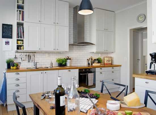 Обилие светлой, тем более белой отделки делает помещение не только чистым и свежим на вид, но и весьма прохладным. Привнести недостающую интерьеру теплоту может древесина, как способ отделки тех или иных поверхностей, так и сырье для изготовления мебели или кухонных аксессуаров.