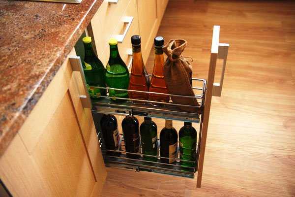 - Контейнеры для емкостей – решение для узкой выдвижной вертикальной полки. Последняя с некоторых пор появилась во всех современных гарнитурах и очень удобна: при выдвижении все ее содержимое оказывается на виду, но при этом легко извлечь именно ту банку или бутылку, которая требуется. Полка может размещаться как рядом с обычным навесным шкафом, так и между колоннами.