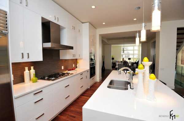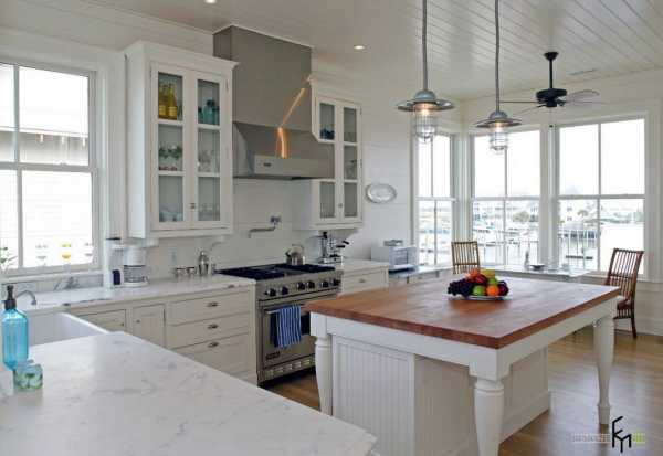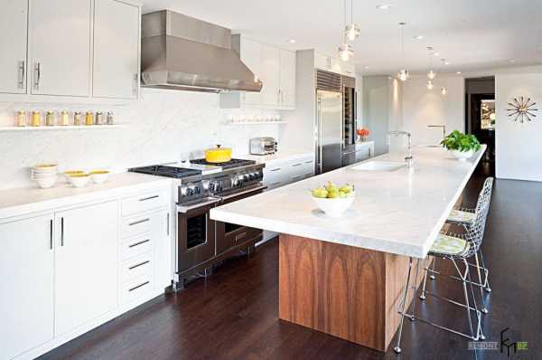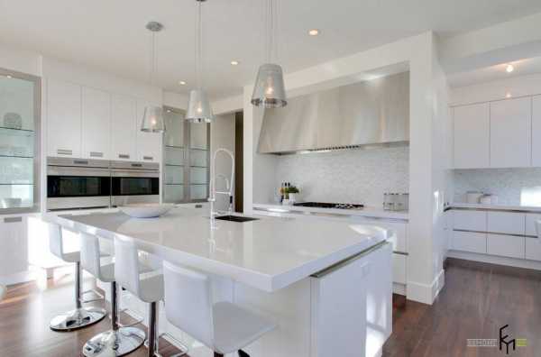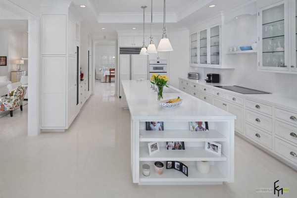Белоснежная отделка стен и потолка, безусловно, нуждается в некотором цветовом отступлении, если кухонные шкафы также выполнены в светлых тонах, то привнести цвет в интерьер можно с помощью системы освещения, напольного покрытия, каменных или деревянных столешниц острова и рабочих поверхностей, а также аксессуаров и декора.