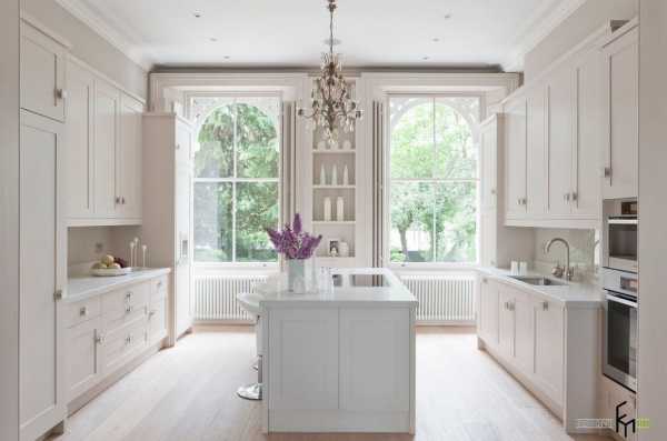 Еще одна классическая кухня, но не в чисто-белом варианте, а с примесью пастельных фиолетовых оттенков. Просторное помещение с большими окнами в арочном оформлении выглядит роскошно в этом цвете. Праздничного настроения традиционной обстановке добавила по-королевски шикарная люстра с множеством стеклянных подвесных элементов.