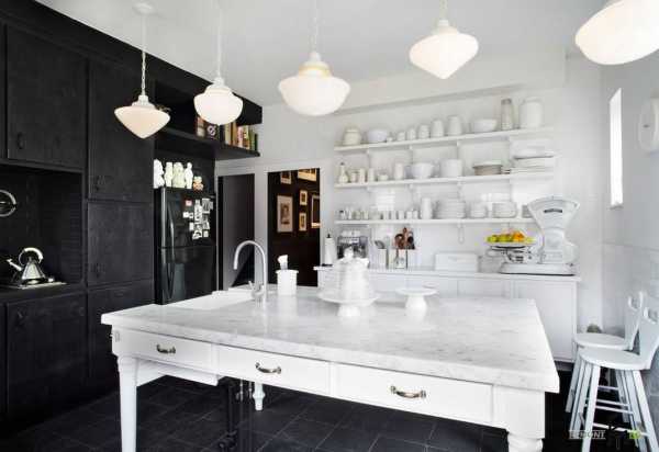 Черная система шкафов вместе с холодильником такого же тона, противопоставляется белоснежным открытым полкам для посуды и светлой палитрой мрамора для столешниц. Белоснежный потолок «смотрит» на невероятно темную плитку напольного покрытия. Такой дизайн сложно забыть и назвать тривиальным, он весьма персонализирован и необычен.