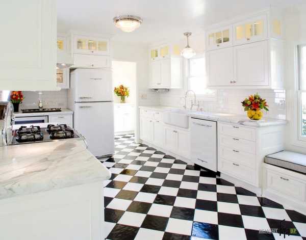 Черно-белая шахматная клетка отлично выглядит в качестве облицовки полов в помещении кухни классического стиля, особенно, если бытовая техника стилизована под рэтро-стилистику.