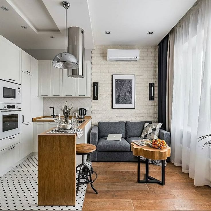 - Идеальная перегородка между кухней и гостиной — барная стойка (конкретно стол-стойка т.е. широкая либо остров). Можно с приставленным диваном.
