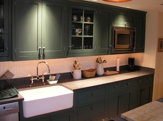 Деревянный кухонный гарнитур, окрашенный в светлые оливковые тона, превосходно впишется в пестрый и изящный прованский стиль. Лучше выбирать для этого кухню с традиционным дизайном, где сочетаются открытые полки и закрытые шкафы. Подобрать готовую кухню, подходящую по стилю и оттенку, может быть непросто, однако гарнитур можно сделать на заказ либо самостоятельно покрасить обычные деревянные шкафчики. В сочетании с белой плиткой, цветочными орнаментами текстиля и неброским декором светлый оливковый гарнитур будет выглядеть очень уместно.