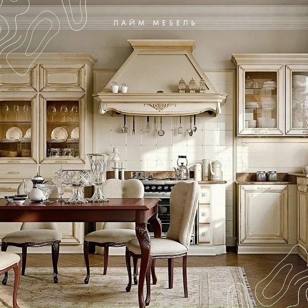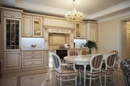 симметрия и правильная геометрия: круглый или овальный обеденный стол, симметричные угловые гарнитуры, обои в полоску, симметричные шторы и люстра, кирпичный фартук, круглые ручки фасадов, строгая отделка стен; - элегантный декор: порталы в проеме между рабочей и столовой зоной, возле вытяжки, имитация колонн как в мебели, так и в оформлении, молдинги, лепнина, накладки, но все в меру, ажурные детали штор, обои с рисунком, эмалированные ручки;