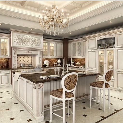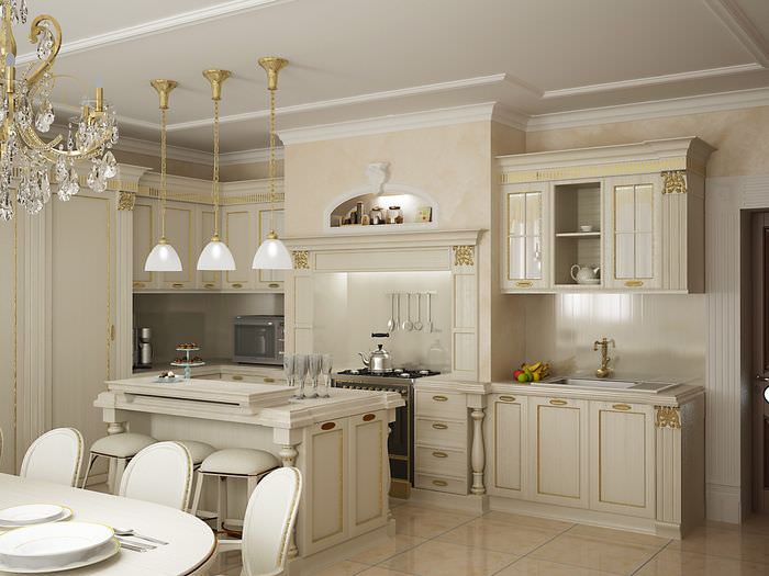 В классическом стиле очень важным элементом является люстра. Она присутствует в таком помещении над обеденным столом или островом, если таковой заменяет столовую. Хотя заменить такой деталью полноценный обеденный комплект уместно лишь в хрущевке, так как в просторном частном доме не нужно отказываться от столь важного символа семейных традиций.