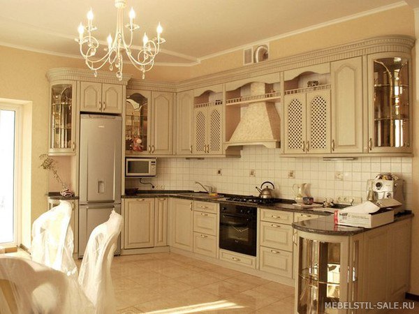Обычно такой дизайн реализован без лишней лепнины и порталов. Это может быть как прямая кухня, так угловые гарнитуры с островом. Но фасады мебели украшены ненавязчивой фрезеровкой, стеклянными вставками без ажура и резьбы. Используются легкие занавески, немного отделки патиной, минимум декора штор.
