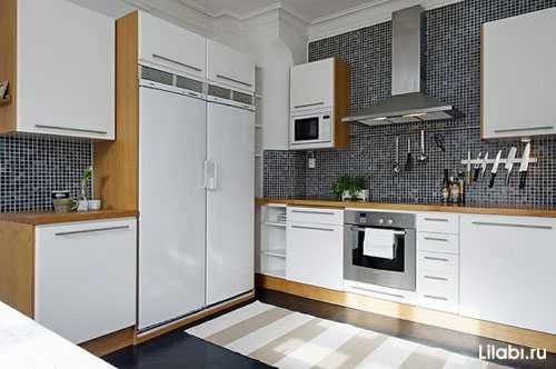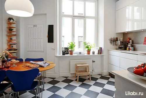 На сегодняшний день существуем огромный выбор кухонной мебели, которую легко можно подобрать под любой из стилей интерьера. В последнее время набирают популярность кухни без верхних шкафов и кухни из натурального дерева. Самое трендовое сочетание цветов в интерьере кухни: белый глянец и светлое дерево. Такое сочетание часто используется в скандинавских интерьерах. В комбинации с шахматным полом такая кухня всегда будет выглядеть стильно и модно.
