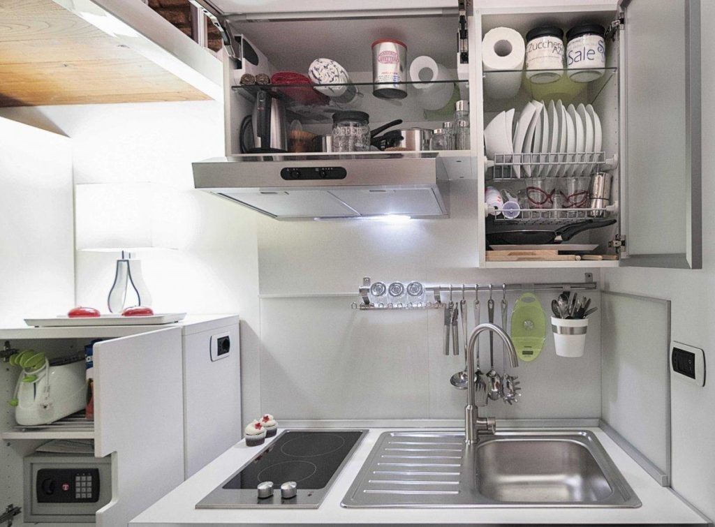 Для того что бы на очень маленькой кухне разместить максимальное количество техники, стоит пересмотреть её размеры. Это касается как крупной так и мелкой бытовой техники.
