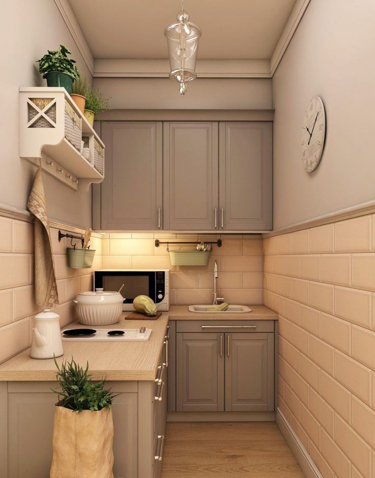 Очень маленькую кухню желательно оформлять в светлых тонах. Это, конечно, не добавить ей площади, но позволит увеличить визуально.