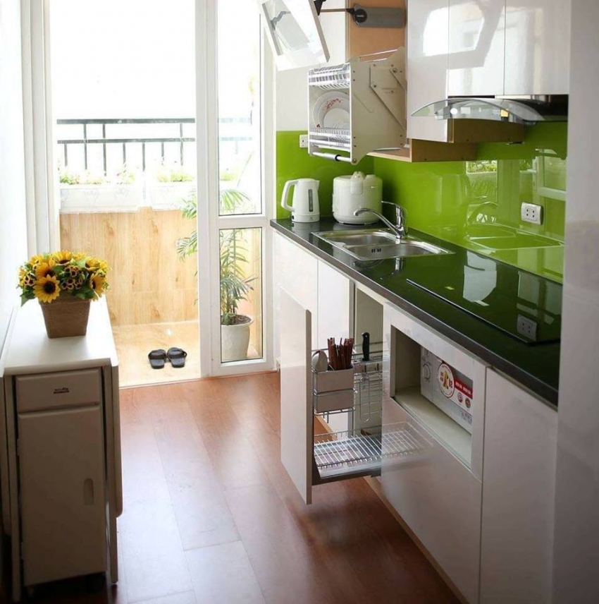 Поскольку в очень маленькой кухне минимум места, мебель для такой кухни должна быть максимально функциональна. Так как площадь кухни менее 5 кв.м. не стандартна, то мебель для такой кухни лучше всего делать на заказ. Так вы сможете максимально всё продумать и использовать каждый сантиметр имеющейся площади.
