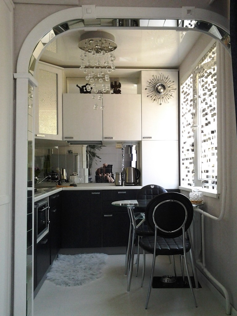 Стол стеклянный с полочкой. На полочку очень удачно вписались лишние зеркальца от шторы (штора была длинная, и пришлось обрезать ее ровно до подоконника). Отрезанные зеркальца приклеила к нижней полочке стола и получился необычный «комплект» из штор и стола. Еще использовала эти «лишние» зеркальца для декора холодильника и арки.