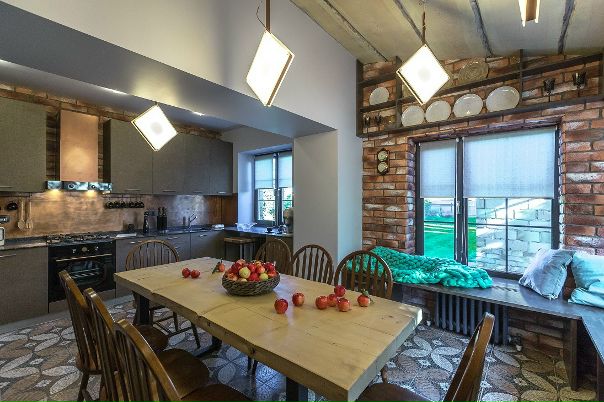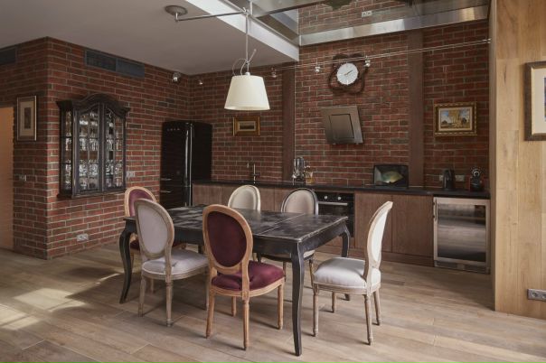 В первую очередь, для оформления пространства кухни-гостиной нужно заняться ремонтом помещения. Лучше всего, если стены в комнате будут иметь первозданный вид. Тут актуальны такие варианты, как каменная или кирпичная кладка или отделка грубой штукатуркой.