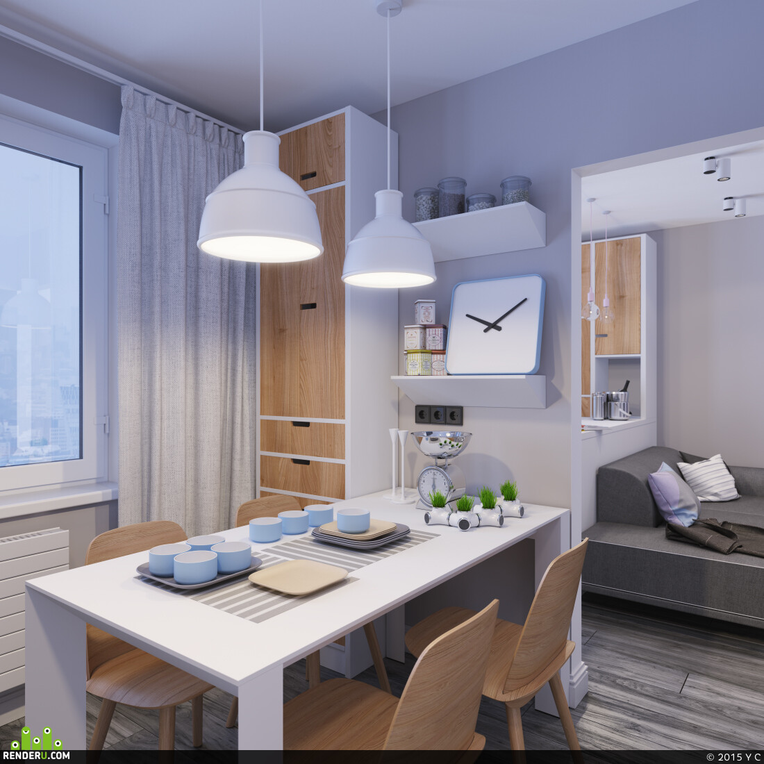 Если вы хотите снизить акцент внимание на кухонном пространстве, используйте нейтральные тона. А спальню и гостиную сделайте сочнее, насыщеннее. Если кухня в квартире-студии находится далеко от окна, используйте много разных светильников: подвесные, точечные, подсветку.