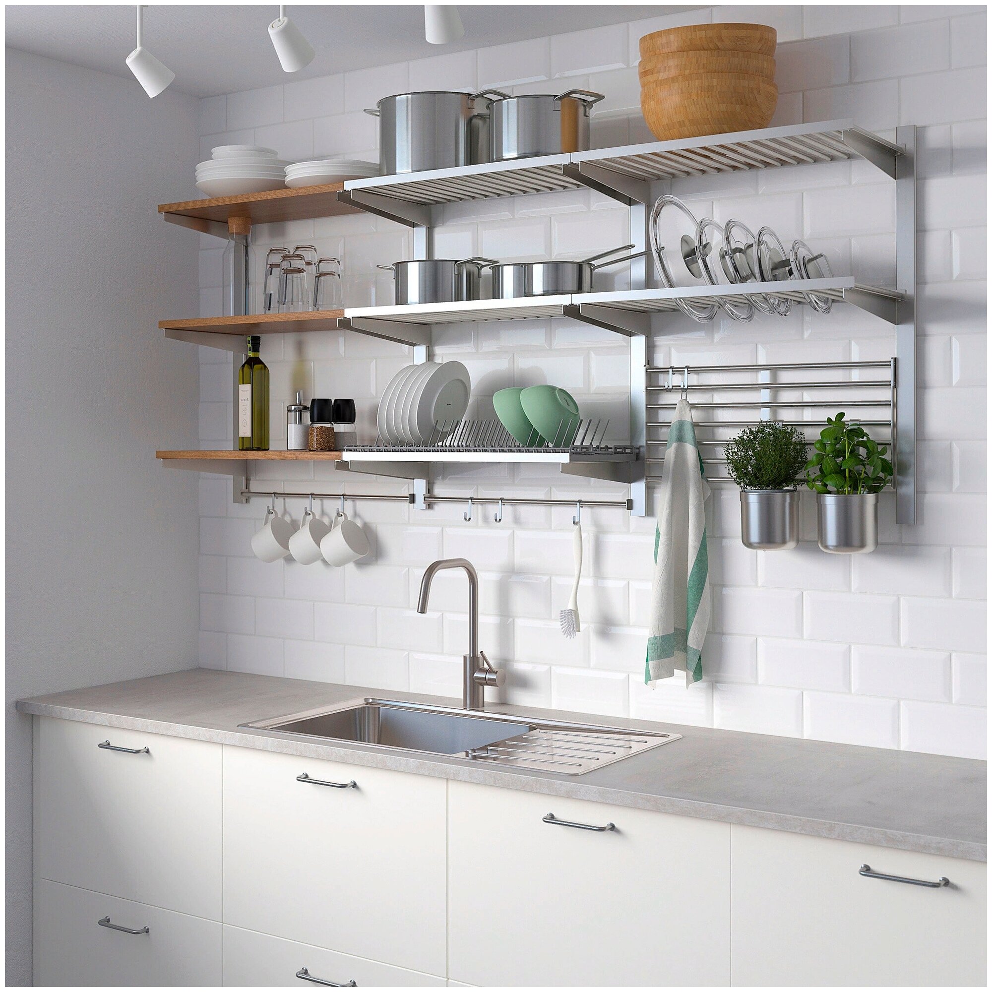 Гарнитур верхними полками даст минимум места для расстановки хранения посуды и утвари. Выход — использование рейлинговой системы. Это открытые полки, изготовленные из облегченного металла.