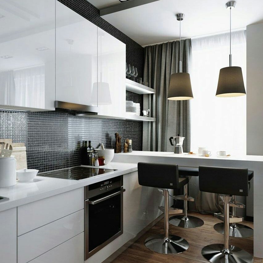 Здесь важно использовать максимально функциональную кухонную мебель и постараться избавиться от всего лишнего. Отличным вариантом станет объединение маленькой кухни с гостиной или столовой, с зонированием пространства той самой барной стойкой или столом.