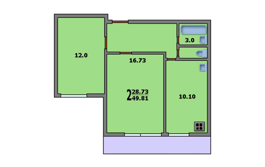 Общая площадь: 48.76 м2 Жилая площадь: 27.30 м2 Площадь кухни: 7.4 м2 |