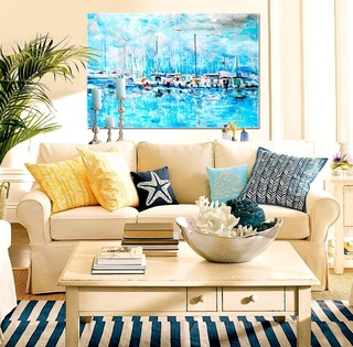 Пейзажи (особенно осенние или зимние) желательно заменить более «летними» вариантами ― натюрмортами с живыми цветами, картинами зеленого леса или луга, пейзажами морской тематики. Можно по-новому взглянуть и на фоторамки, украсив их небольшими ракушками, морскими звездами, или же задекорировав бамбуковыми палочками либо тростником.