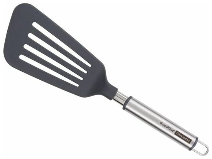 На конце ручки имеется отверстие, не самое маленькое, для возможности подвешивания лопатки на крючок. На самой ручки красуется надпись Tefal.