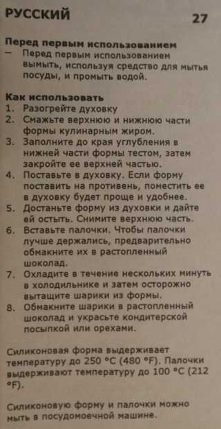 Силиконовая форма выдерживает температуру до 250 °C (480 °F). Палочки можно использовать при температуре до 100 °C (212 °F).