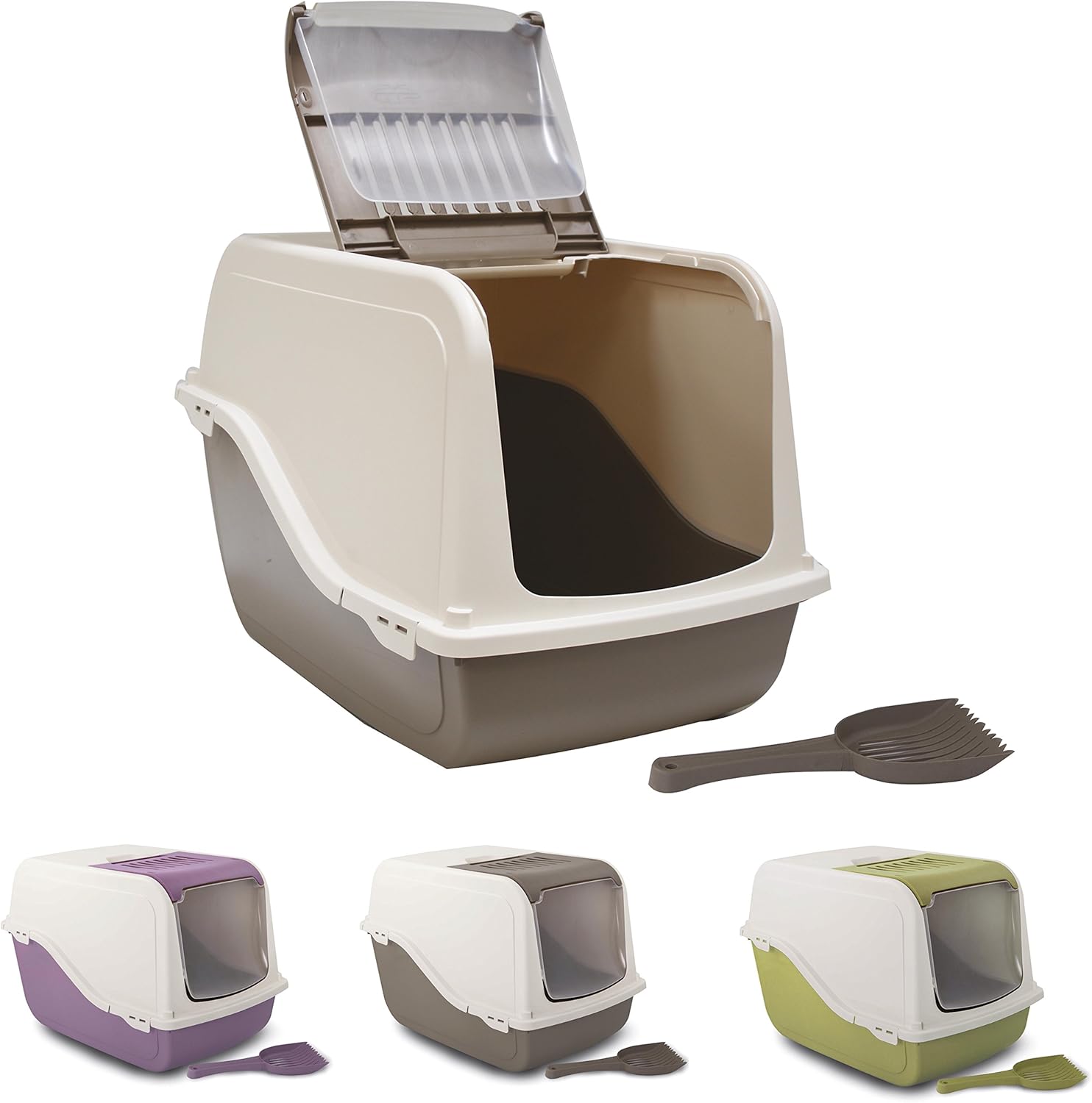 Кошачий домик-туалет может быть с подвижной дверцей или без; внутри находится лоток, куда насыпается наполнитель. Лотки тоже бывают разных видов, с сеткой или без неё. Во время уборки верхняя крышка, прикрепленная ко дну удобными клипсами, легко снимается.
