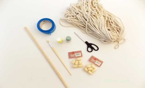 - Берем для работы плотную хлопчатобумажную веревку длиной 40 метров, круглую палочку из дерева или пластика. Можно взять нити двух цветов, чтобы отделить основу от кармашка.