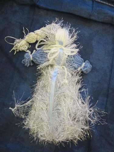 Подравняйте оставшиеся нити и распушить их концы. Вернёмся к колечкам: колечки — глаза вашего шедевра, берите обрезки нитей, нарежьте 20 нитей по 12 сантиметров. И на все 2 кольца прикрепите 10 нитей по диаметру, используя при этом «2 способ крепления». Прикрепляем нити с обратной стороны композиции. Концы ниток опять же распушите.
