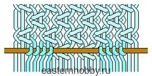 - Фиксируем 20 составляющих на палочке классическим способом узелкового крепления. Начинаем процесс плетения, строго придерживаясь схемы на рисунке.