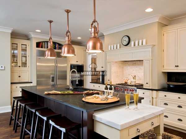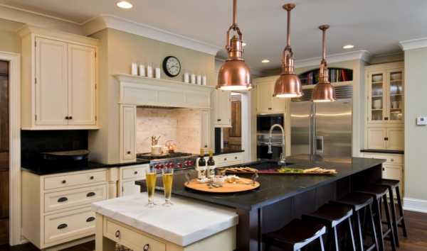 Дизайн интерьера кухни в стиле неоклассика и медные светильники