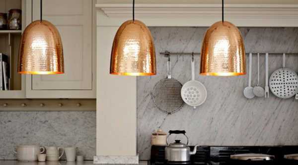 Медная арматура у светильников в кухонном интерьере может показаться кому-то старомодной, но перемены неизбежны, мода – вещь непостоянная. Никто особо не ожидал возвращения в мир моды даже латунного каркаса, тем более медного.