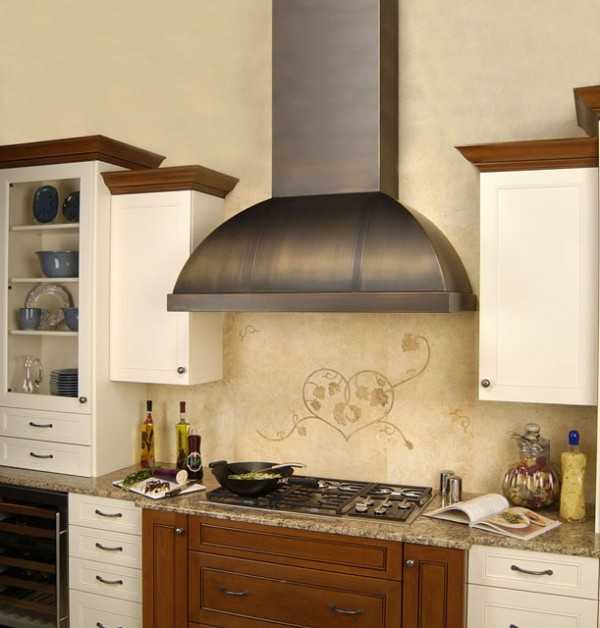 Настоящее буйство красок огненного металла можно произвести и на вашей кухне. И в первую очередь, это использование медной посуды: сковородки и половники, пафосные подносы и ажурные блюда для фруктов с искусно выполненной чеканкой. Все это богатство может быть дополнено выполненными из того же материала свисающими светильниками, а медная вытяжка может служить вам долгие годы.