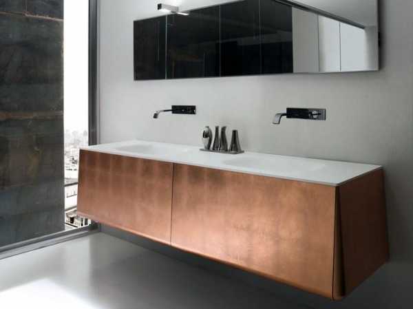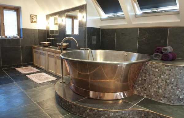 Медные ванны, раковины и смесители привносят в интерьер атмосферу винтажной старины, однако вполне соответствуют современным функциональным требованиям. Кроме того, медь обладает хорошими гигиеническими и антибактериальными свойствами, что делает актуальным ее применение в помещениях с повышенной влажностью.
