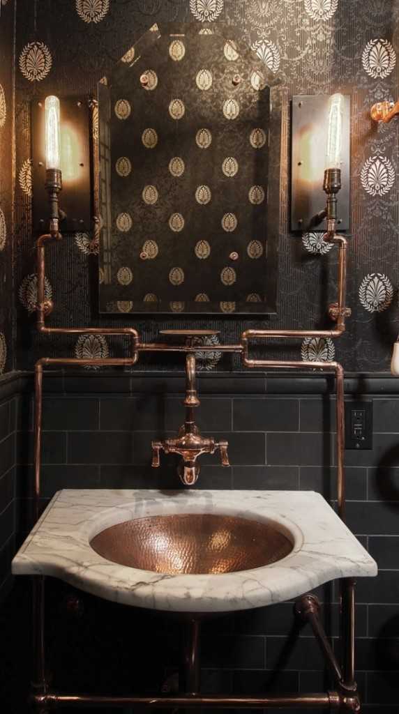 Дизайн санузла кафе в стиле стимпанкМедь можно использовать как в отделке, так и в декорировании. Несколько штрихов на стене, или же медная ваза способны добавить стиль и определенный характер Вашему интерьеру.