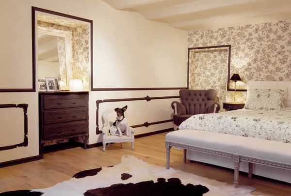 Оформив при помощи обоев другого цвета и молдингов , к примеру, одну из стен в спальне, можно выделить зону отдыха.
