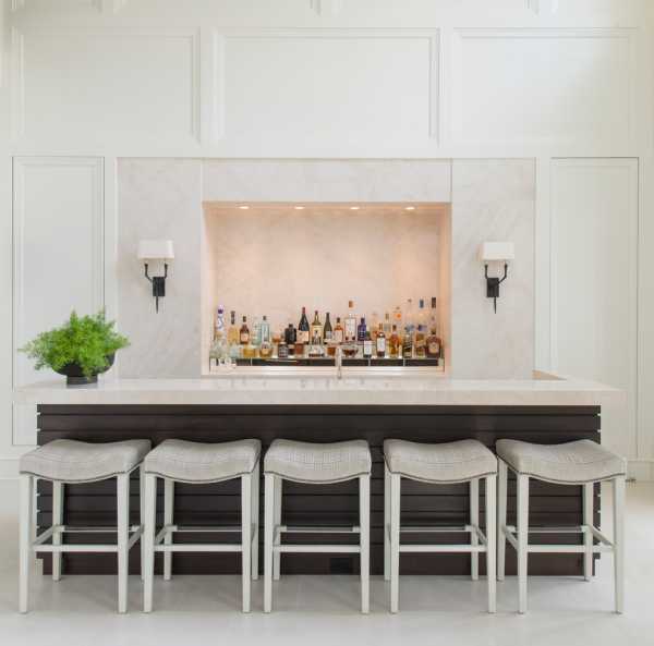 Возможностей украсить гостиную, преобразить ее, придать свежести или сдержанности — предостаточно, и это благодаря плинтусам. На нижепредставленном фото — молдинги на стенах в интерьере, разделяющие помещение на зоны и подчеркивающие бар.