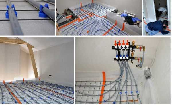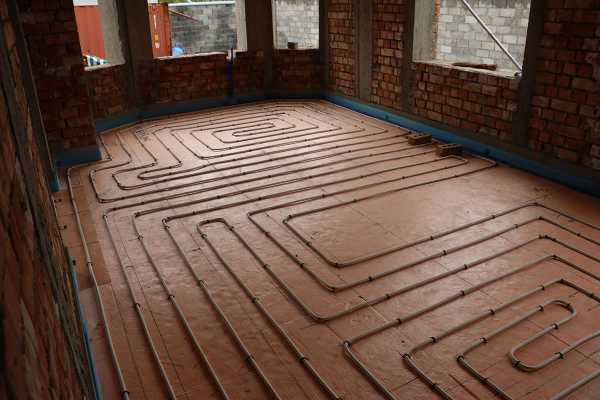 Для трубопровода необходимо предусмотреть контур. Его монтируют из фанеры; выводят проходы и места изгиба трубы. В желоба укладывают металлические пластины. В них располагают трубы. Магистраль закрывают гипсокартоном или фанерой. После чего начинают отделку финишного покрытия пола.