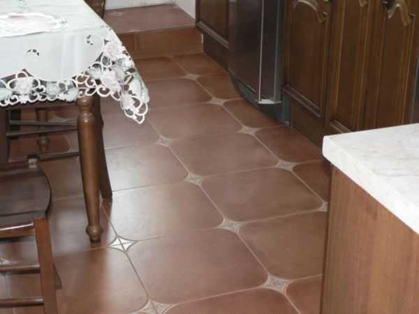 Напольное покрытие выбирают в зависимости от назначения помещения. В гостиной укладывают ламинат или линолеум. На кухне, в прихожей, в ванной комнате обустраивают кафельный пол.