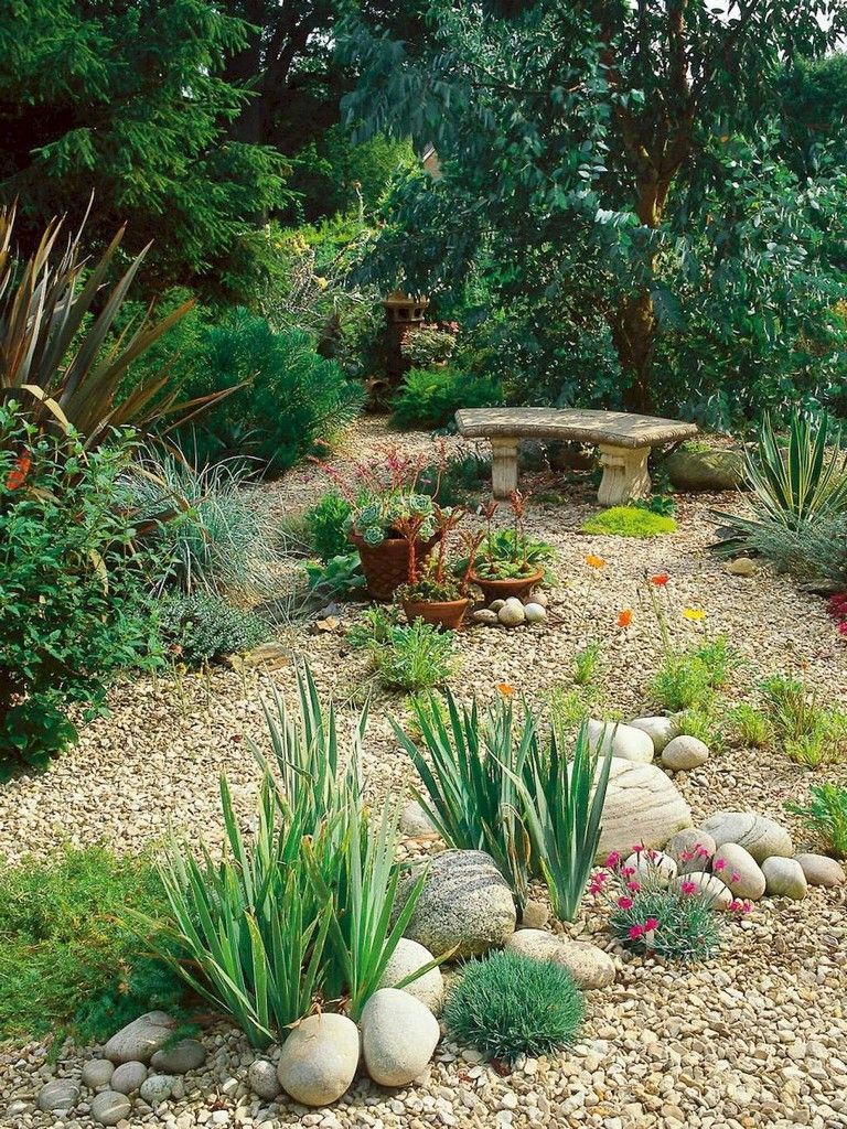 Это популярная разновидность каменной композиции. Разбивают такой сад на полузатененной территории, почва его должна быть умеренно влажной. Если есть природные неровности ландшафта, их не ликвидируют, поскольку гравийный сад — это композиция пейзажного стиля, гармонично вписывающаяся в естественные условия. Как и любой каменный сад, гравийный имеет произвольную неровную форму с плавными изгибами, не имеющую острых углов. Поверхность площадки такого сада покрывают гравийной отсыпкой, для этого нужно приобрести мелкофракционный гравий желаемого цвета в таком количестве, чтобы его хватило на пятисантиметровую подушку. Его укладывают на песок либо торф, предварительно застеленный плотным геотекстилем.